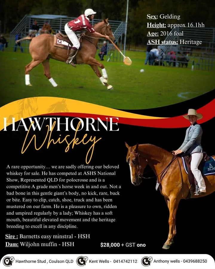 Hawthorne Whiskey is a proven, reliable A Grade Men’s polocrosse horse for the Warwick Club, State representative horse at Barastoc U26 Competition 3 years running, winning numerous Man of the Match Awards and Best Horse and Rider or position trophies. Whiskey also completed at 2026 ASHS Nationals Show.
