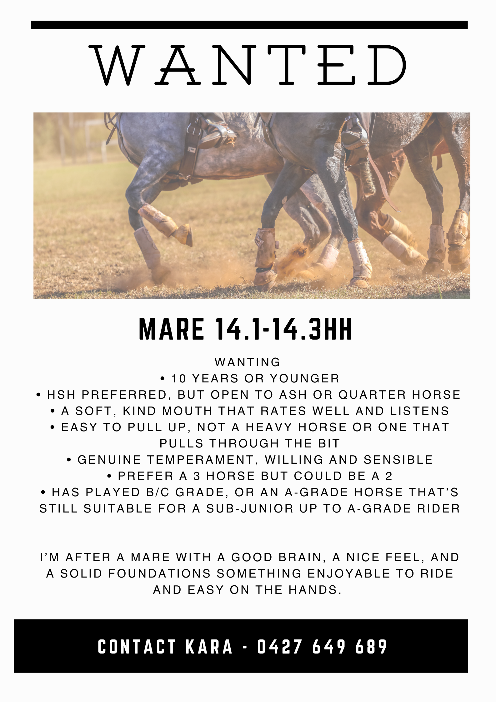 I’m after a mare with a good brain, a nice feel, and a solid foundations something enjoyable to ride and easy on the hands.